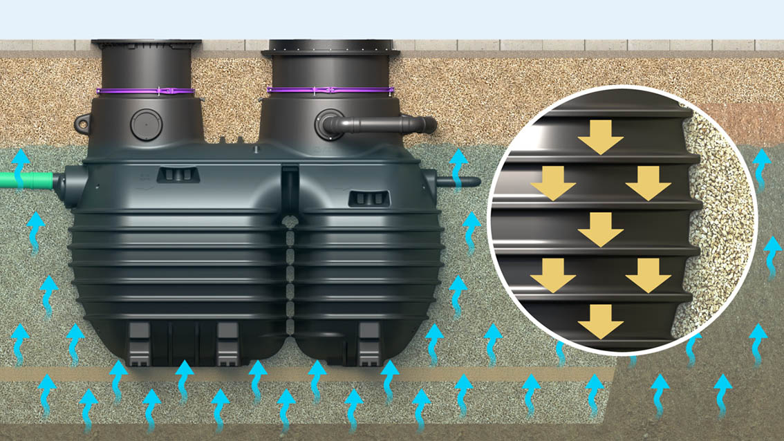 EasyClean ground Multi'nin haznesi, yer altı suyuna karşı yüksek dayanıklılığı sayesinde yüksek su seviyesinde bile güvenlik sunar. Kaburgalı yapı, toprakta mükemmel stabilite sağlar – zorlu koşullar altında uzun ömürlü ve güvenilir kullanım için idealdir.